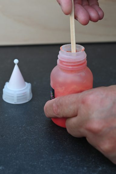 Wie auf dem ersten Bild zu sehen ist, wirken hier ganz normale physikalische Gesetze: Das schwerere Material – das Glaspulver – setzt sich am Boden ab, während das leichtere Malmedium oben schwimmt. In diesem Zustand können wir die Farbe jedoch nicht sinnvoll verwenden. Deshalb müssen wir beides wieder gut miteinander vermischen. Dafür gibt es drei Möglichkeiten: