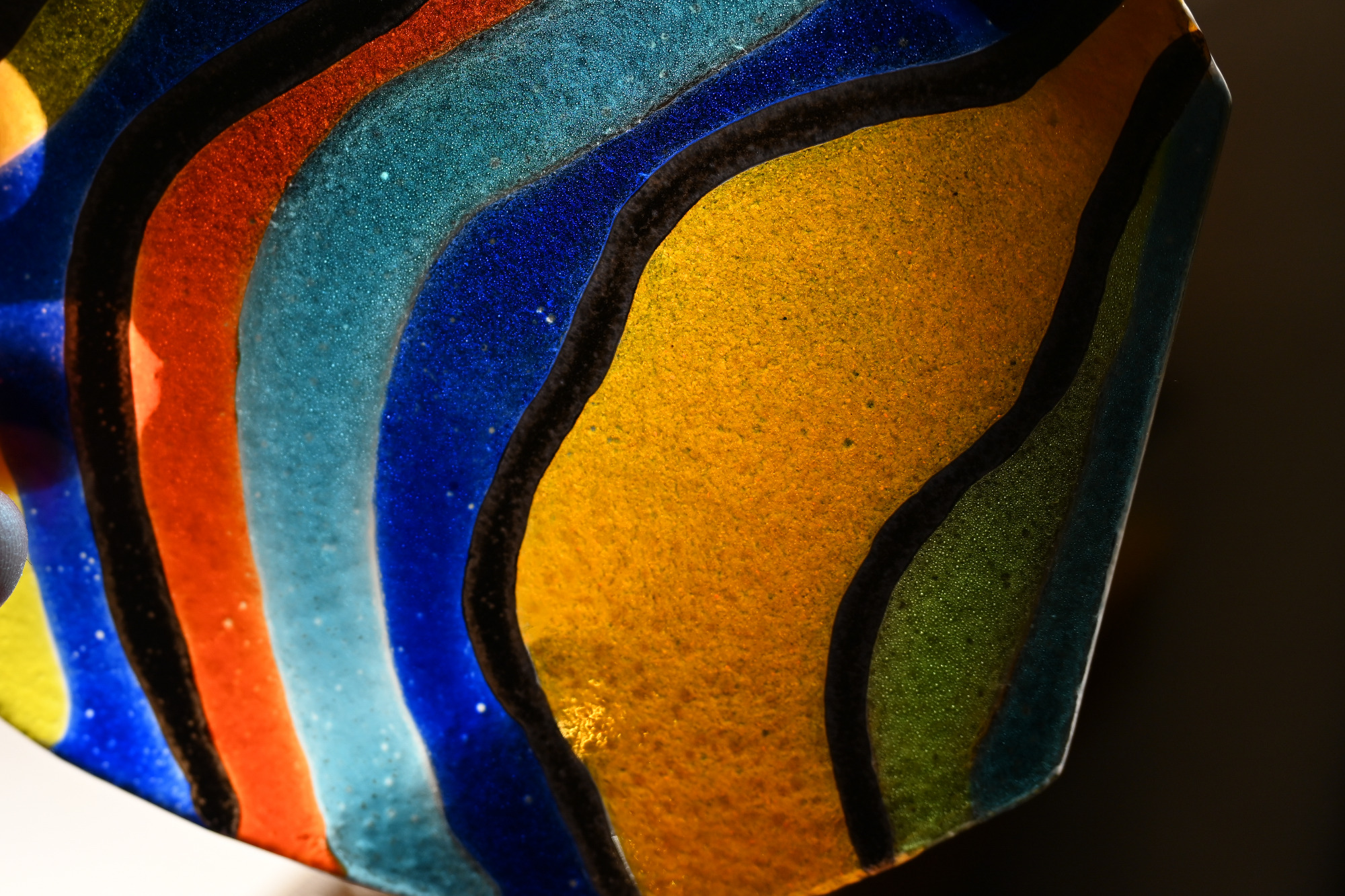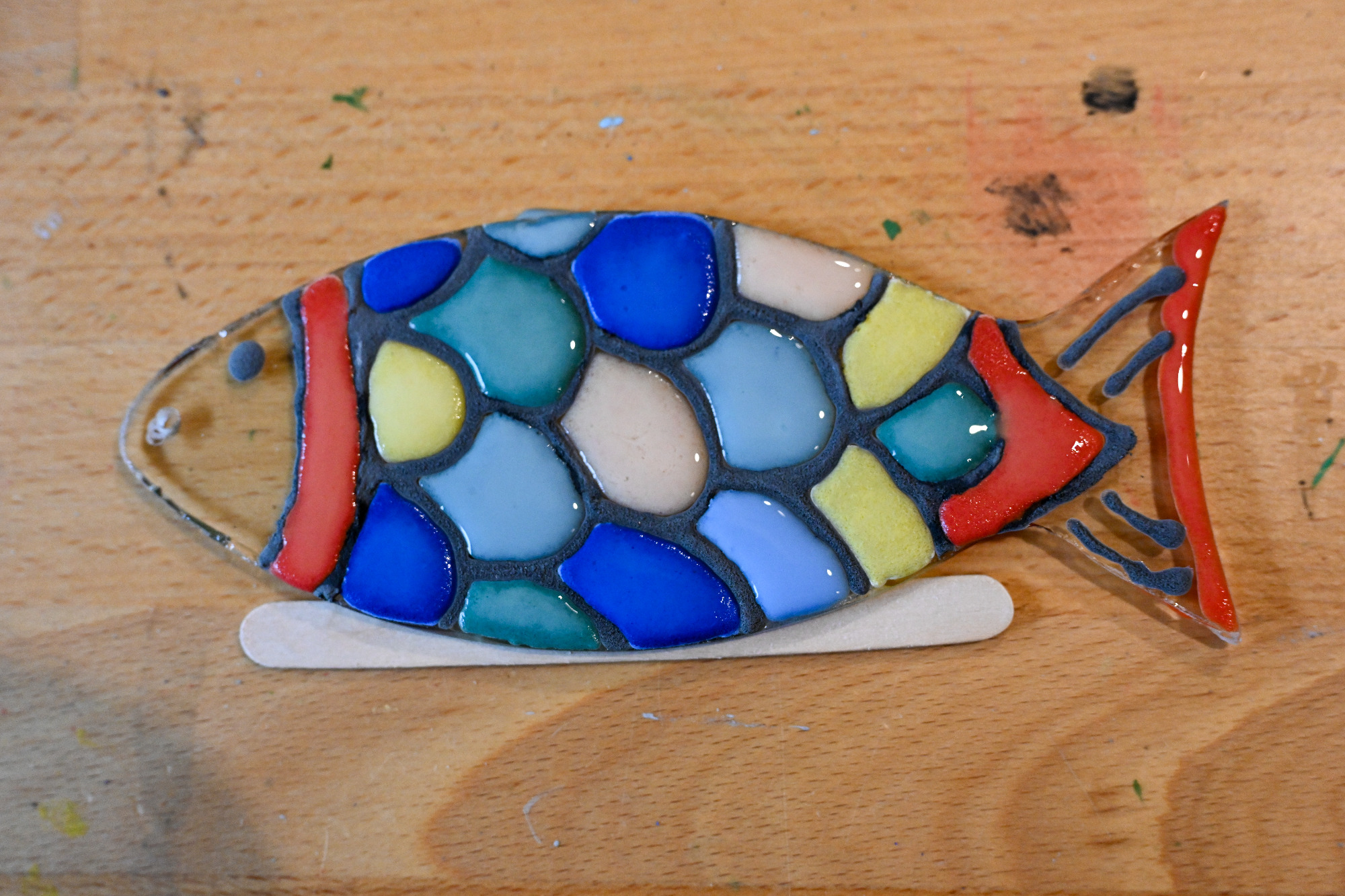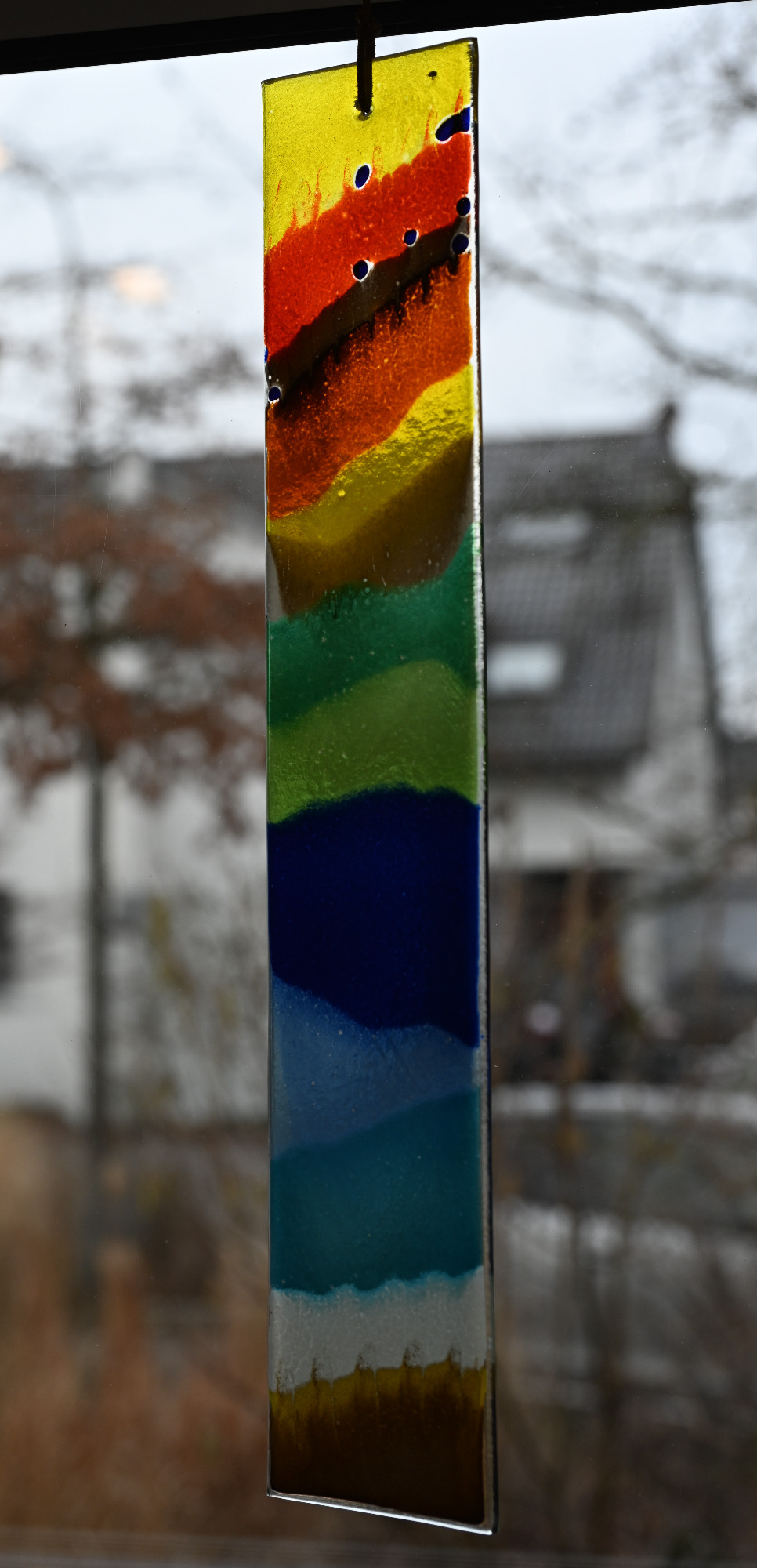 Danach kann die Flasche geschüttelt werden. Diese Methode funktioniert zwar, hat aber einen Nachteil: Beim Schütteln entstehen viele kleine Luftblasen, die später im gebrannten Glas sichtbar bleiben können. Ein Beispiel dafür sieht man im zweiten Bild, besonders in den Blautönen, wo größere Blasen erkennbar sind.