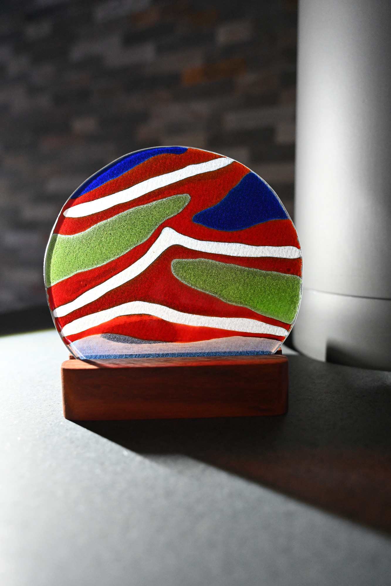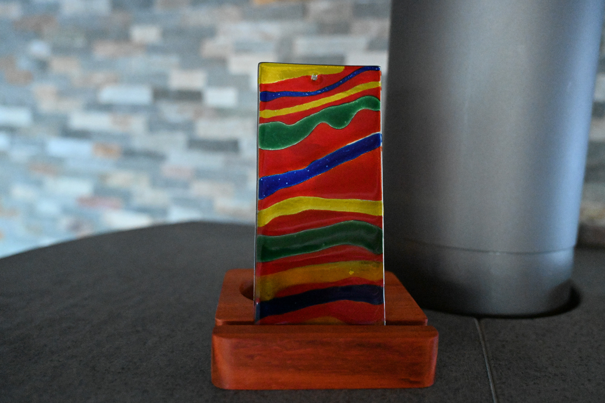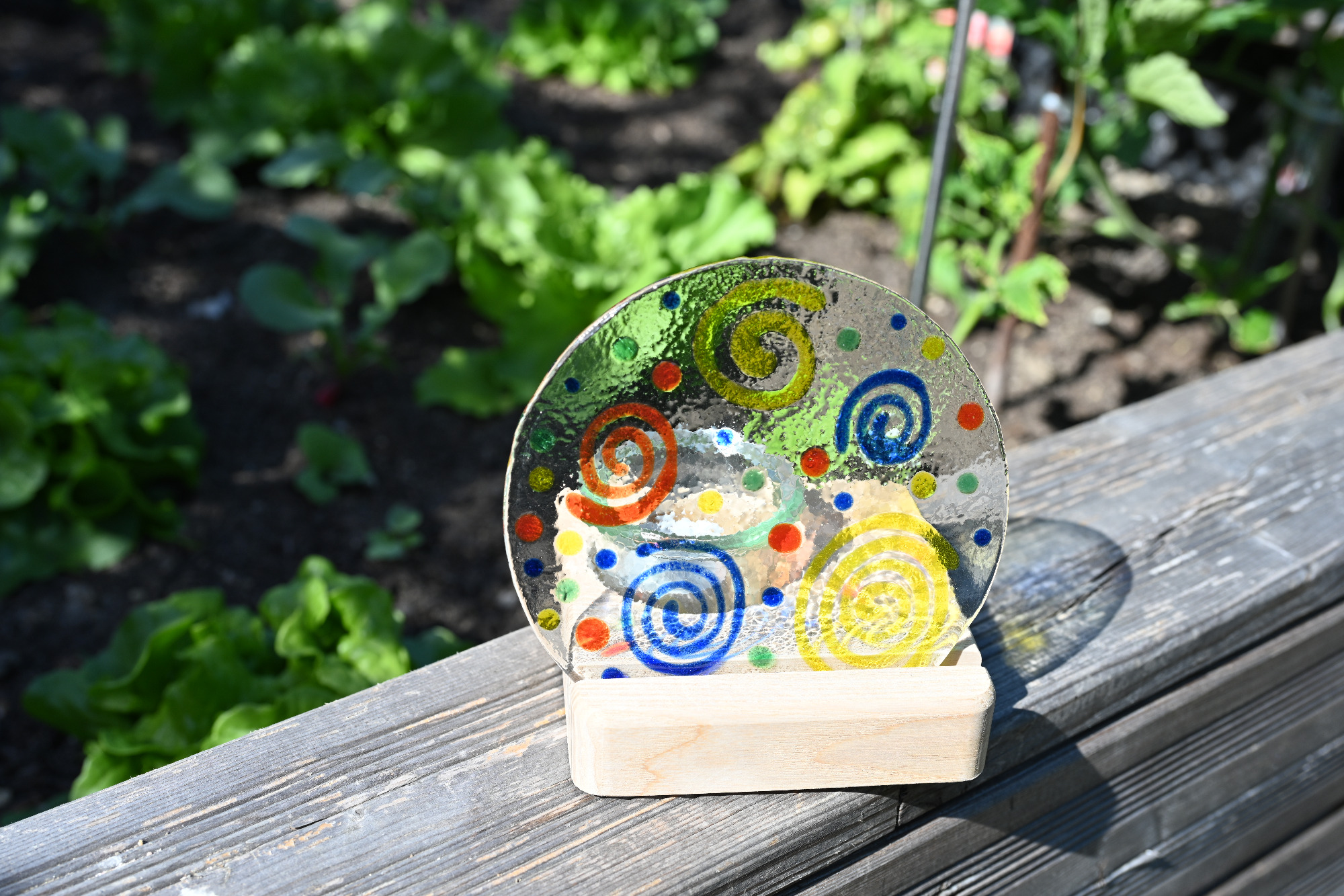 Danach kann die Flasche geschüttelt werden. Diese Methode funktioniert zwar, hat aber einen Nachteil: Beim Schütteln entstehen viele kleine Luftblasen, die später im gebrannten Glas sichtbar bleiben können. Ein Beispiel dafür sieht man im zweiten Bild, besonders in den Blautönen, wo größere Blasen erkennbar sind.