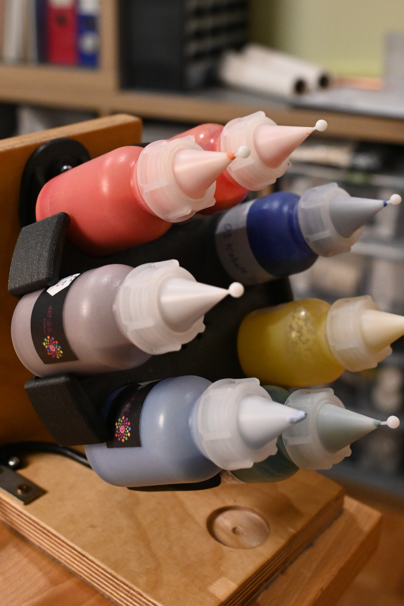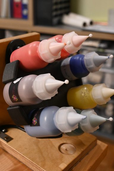 Die bequemste Methode ist die Verwendung eines Mischgeräts (siehe Bild 4). Dabei drehen sich die Flaschen langsam und kontinuierlich. Diese gleichmäßige Bewegung sorgt für eine sehr gute Durchmischung mit kaum Luftblasen. Das Ergebnis zeigt sich später deutlich im fertigen Glasbild durch eine besonders gleichmäßige Farbstruktur.